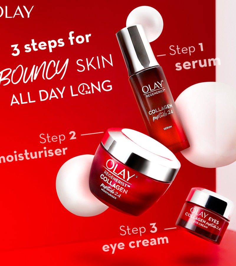 Plump & Bouncy Skin all day long. Olay’s Unique technology Collagen Peptide 24 penetrates^ better into the skin. Regular collagen have larger molecules that couldn’t penetrate into the skin. Olay’s Collagen Peptide is a smaller molecule, hence it penetrates^ better into the skin.